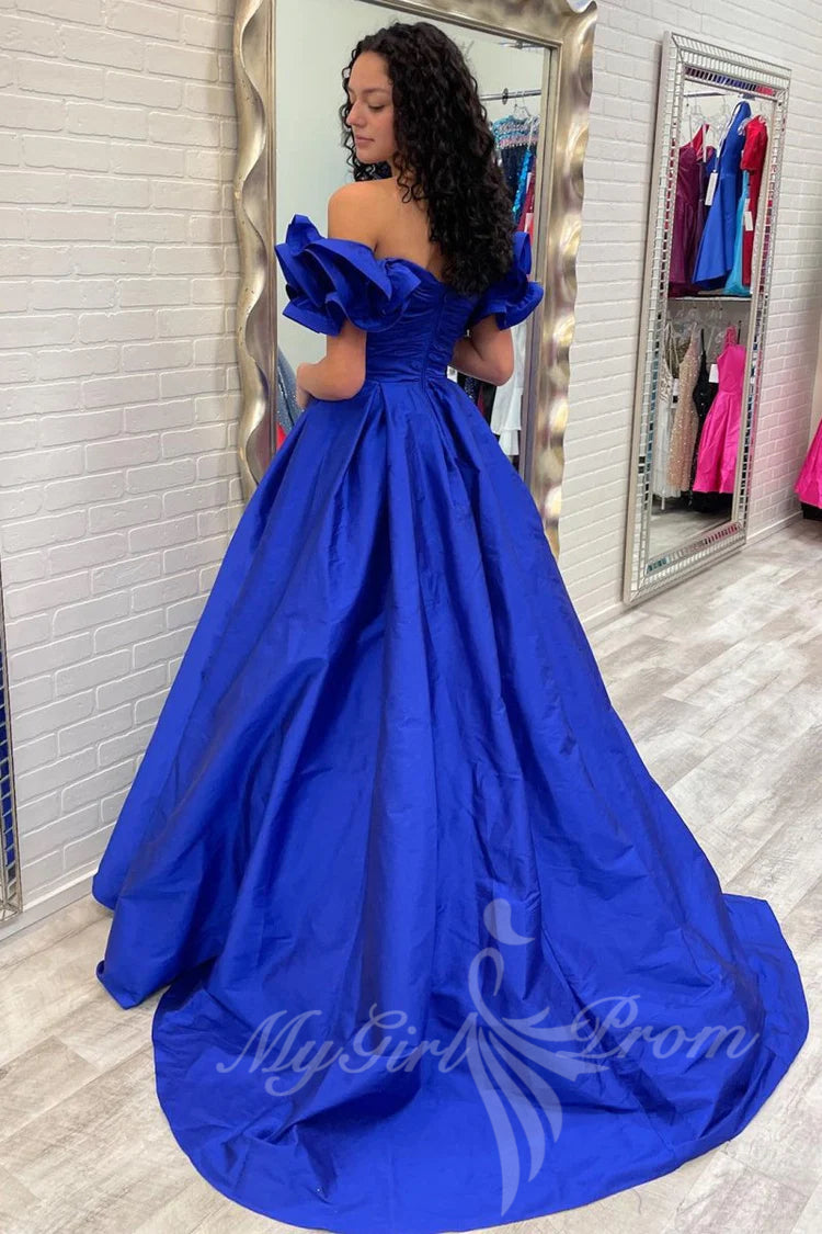 Royal Blue Off the Shoulder Ruffles Sleeves Satin Long Prom Dress GP827
